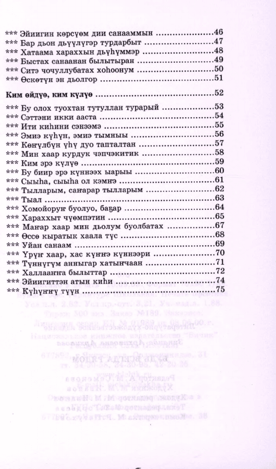 Саргы Куо алгыстаах айанын аартыктара: монография Бэс ыйа: хоһооннор, поэмалар Көлүйэ чуумпутун долгутан Чолбон: уус-уран литературнай уонна общественнай-политическай сурунаал Алтан Сэргэм Чобуо чуорааннарга: хоһооннор Таптал сааскы тыллыылара Стихи поэтов Севера: [Сборник] Этигэн сүрэх айманар тойуга Из века в век. Якутская поэзия